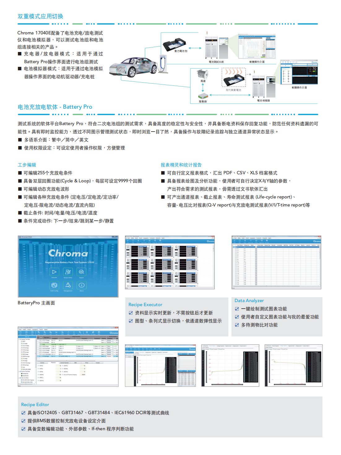 Chroma 17040E电池模组测试系统是专为高功率二次电池组测试而开发的高精密充放电设备,具有能源回收功能,可节省放电过程所消耗的大量电能,即使动态充放电,也能确保电网端维持稳定,不致因谐波污染影响其他设备。